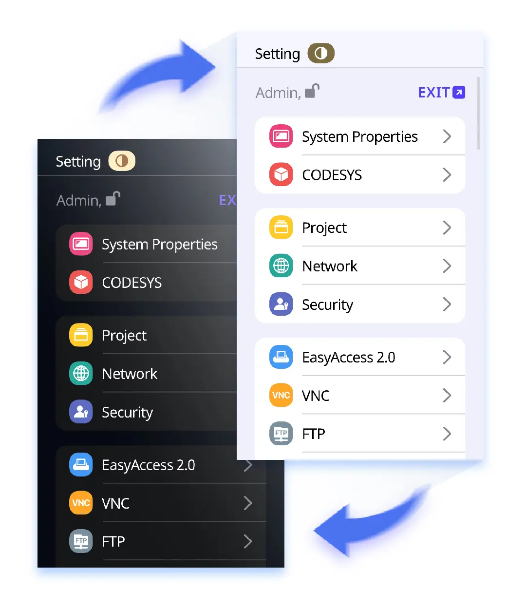 cMT2058XH posiada nowy interfejs ustawień systemowych. HMI został skrupulatnie zaprojektowany, tak aby był łatwy i intuicyjny w obsłudze. Ulepszony interfejs charakteryzuje się spójnym układem, stylem ikon oraz nowymi czcionkami i kolorami Często używane funkcje umieszczone zostały na górze menu, dzięki czemu użytkownik ma do nich szybszy dostęp. Co więcej, aktualizacja poprawia informacje zwrotne z systemu, udostępniając komunikaty o błędach i wskaźniki obciążenia procesora, które poprawią interakcję człowiek-system.