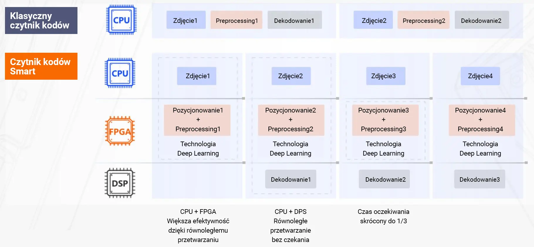 Kamera Smart Code Reading wykorzystuje wbudowany algorytm wielordzeniowy. Zrekonstruowany strumień danych przetwarzany jest równolegle pomiędzy podstawowymi układami CPU, FPGA i DSP. Dzięki temu fotografowanie, pozycjonowanie i dekodowanie są realizowane wielowątkowo. Wpływa to na szybkość odczytu, która jest 3-krotnie większa względem standardowych skanerów kodów.