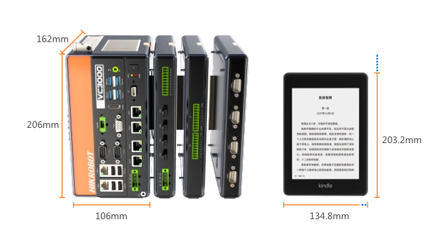 Główny moduł VC3000 jest niezwykle kompaktowy, jego rozmiary to 162 mm x 209 mm x 106 mm. Jego grubość jest porównywalna do grubości dwóch książek, dzięki czemu potrzebujemy mniej miejsca do instalacji. Modułowa konstrukcja umożliwia dowolne łączenie do 3 modułów dodatkowych, które pomogą zapewnić transmisję danych i kontrolę systemu wizyjnego. Kontroler wizyjny tej serii posiada dużo wbudowanych funkcjonalności.