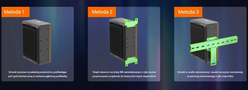Kontroler możemy zainstalować na trzy różne sposoby, dzięki czemu ograniczenia przestrzenne nie stanowią problemu. Kompaktowy designu, małe zużycie energii i odprowadzanie ciepła zapewniają wysoką wydajność. Dzięki tym funkcjonalnościom oraz w połączeniu z optymalizacją na poziomie algorytmu, kontroler wizyjny wyróżnia się na tle innych produktów tego typu.