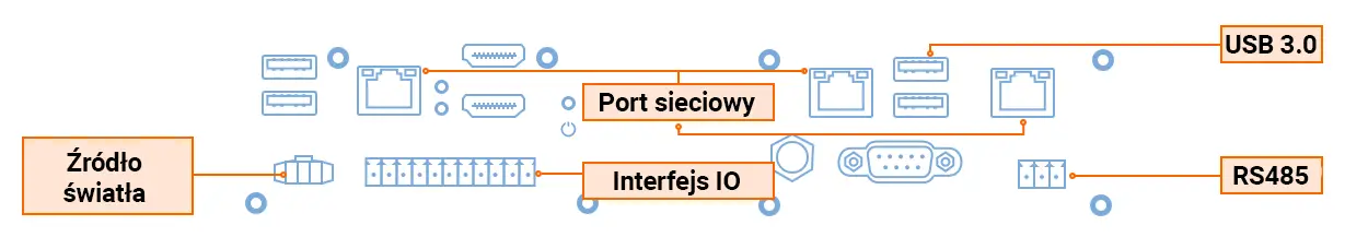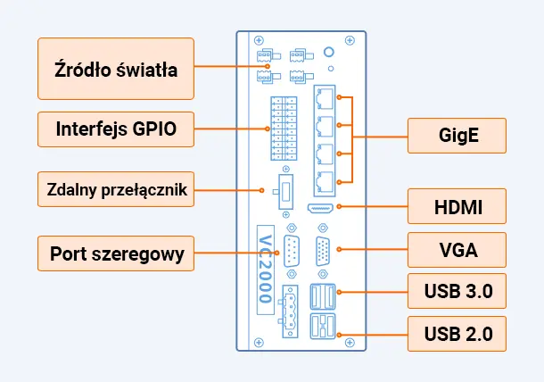 VC2000 posiada 4-kanałowy gigabitowy port sieciowy, 1-kanałowy port szeregowy, 8-wejściowy i 8-wyjściowy GPIO, 4-kanałową kontrolę źródła światła oraz inne interfejsy. Umożliwia użytkownikowi swobodną kontrolę nad interfejsem (demo / SDK i inne metody), co znacząco wpływa na jakość inspekcji wizyjnej.