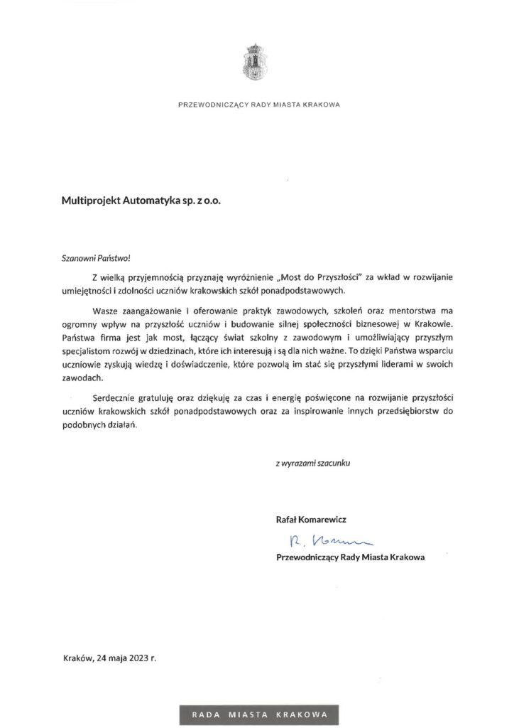 Miło nam poinformować, że nasza firma została nagrodzona przez Przewodniczącego Rady Miasta Krakowa, Rafała Komarewicza podczas gali “Most do Przyszłości”. Wręczenie nagród odbyło się 24 maja 2023 roku w Krakowie. Przewodniczący Rady Miasta Krakowa wręczał wyróżnienia dla firm i przedsiębiorców, którzy wspierają lokalną krakowską edukację w szkołach zawodowych i technicznych.