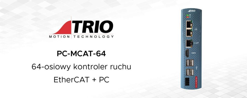 Sterownik PC-MCAT 64 firmy Trio Motion Technology to innowacyjne Rozwiązanie Ruch + PC. Potężny czterordzeniowy procesor Intel Atom użyty został do napędu zarówno wysokowydajnego sterownika ruchu, jak też kompaktowego komputera klasy PC, na którym użytkownik może uruchamiać swoje aplikacje w systemie Windows. Oprogramowanie sterownika PC-MCAT korzysta z rozszerzeń czasu rzeczywistego, aby umożliwić zarówno systemowi Windows, jak i sterownikowi ruchu, działanie bezpośrednio na swoich własnych rdzeniach procesora. Sterownik PC-MCAT 64 ma swój własny dedykowany port nadrzędny Ethernet do komunikacji zgodnie z interfejsem EtherCAT, który umożliwia przesyłanie pakietów danych z błędem synchronizacji mniejszym niż 1 µs. Procesor Atom E3845 o częstotliwości 1.91 GHz działa w parze z 4 GB pamięci RAM oraz możliwym do rozbudowania szybkim dyskiem SSD o pojemności 64 GB, aby zapewnić wystarczającą wydajność komputera dla wielu typów maszyn.