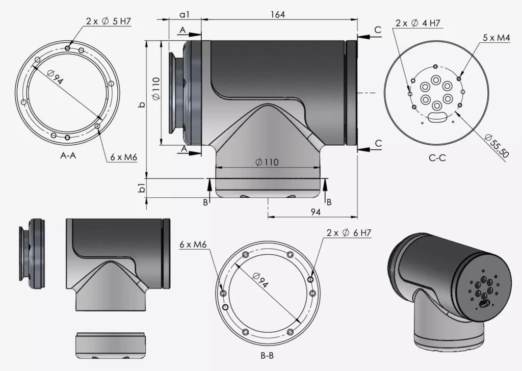 W przypadku, gdy moduł stanowi środek łańcucha kinematycznego, to przewody (wejściowe i wyjściowe) mogą być wyprowadzone od strony flanszy montażowej oraz wyjściowej. Jeżeli do danego modułu nie są dołączone kolejne to przewody wejściowe mogą również być wyprowadzone tylko od strony flanszy montażowej. Przewody mogą również być wyprowadzone z dekli. Pozostałe opcje prowadzenia przewodów wg tabeli kodów oznaczeń. Prosimy o kontakt z naszą obsługa techniczno-handlową w sprawie szczegółów i dostępności opcji.
