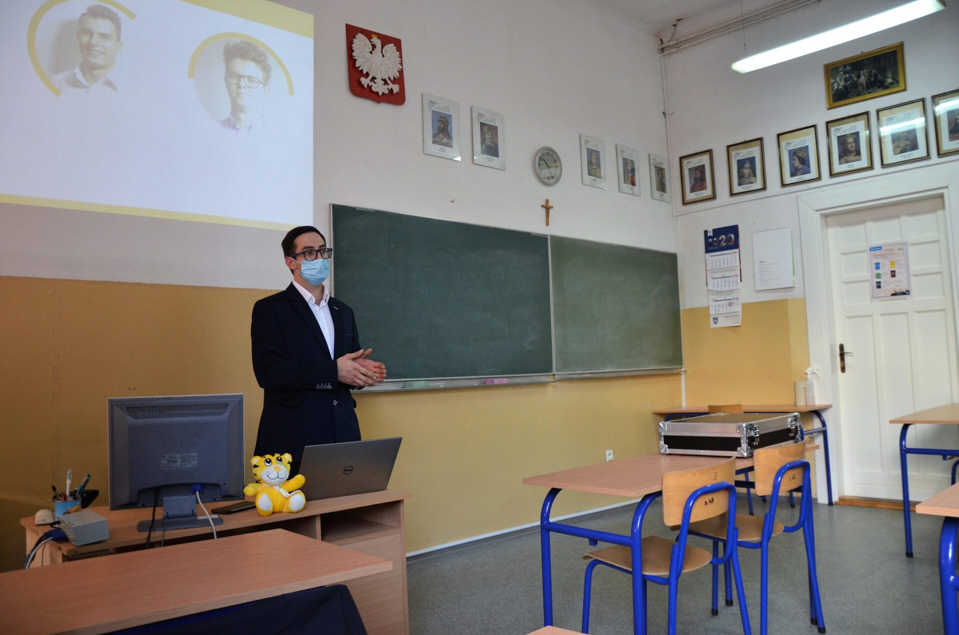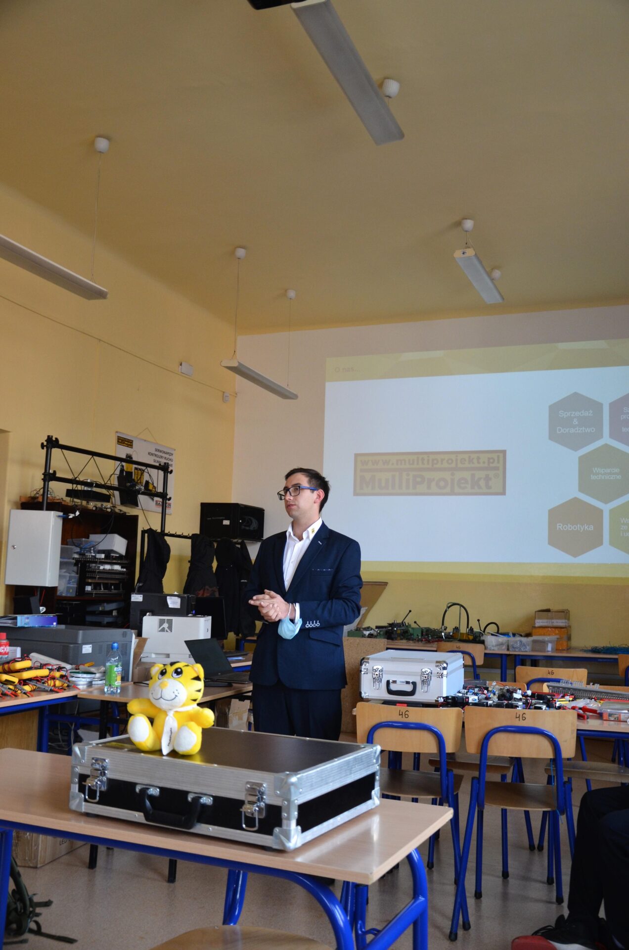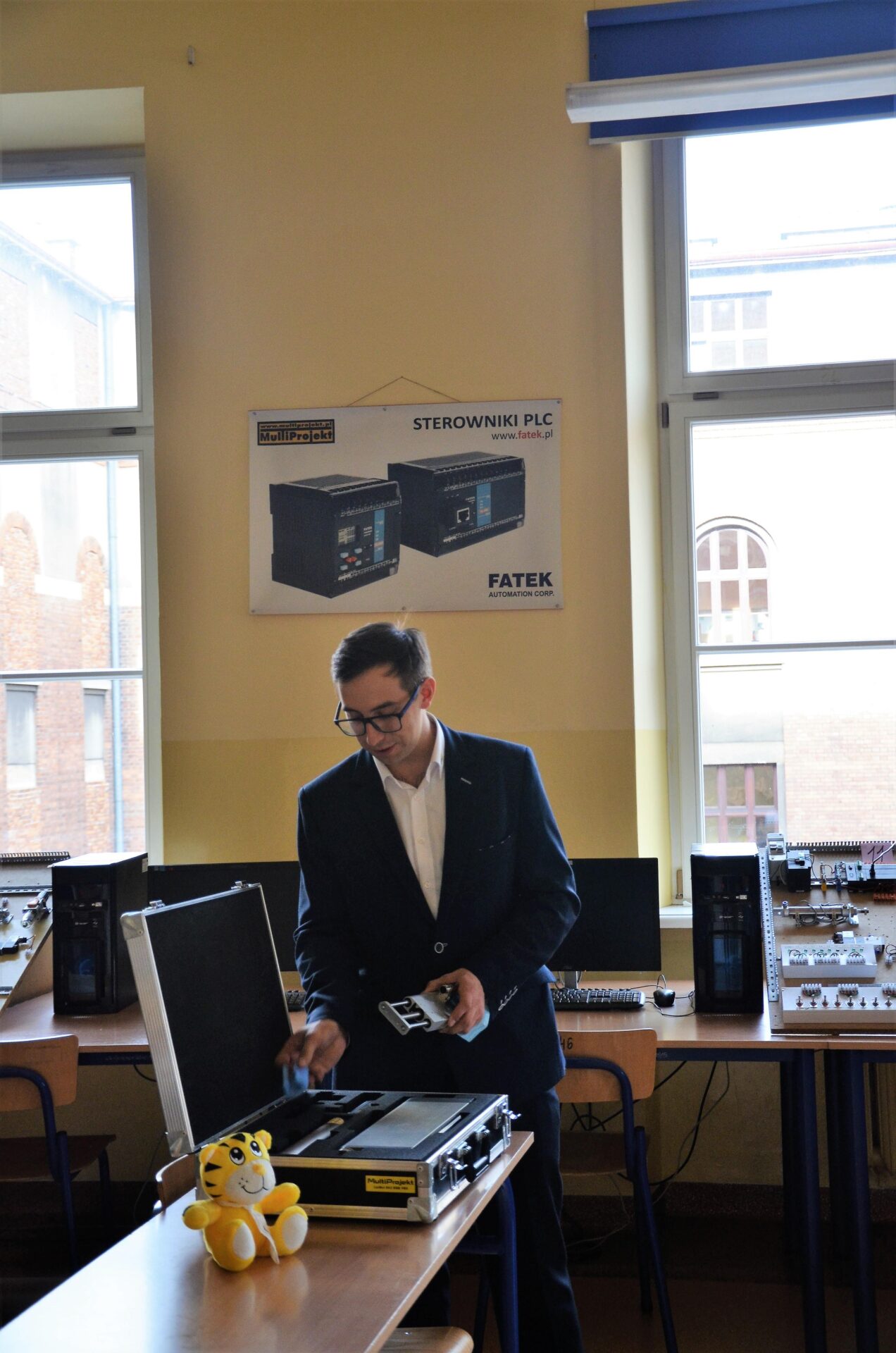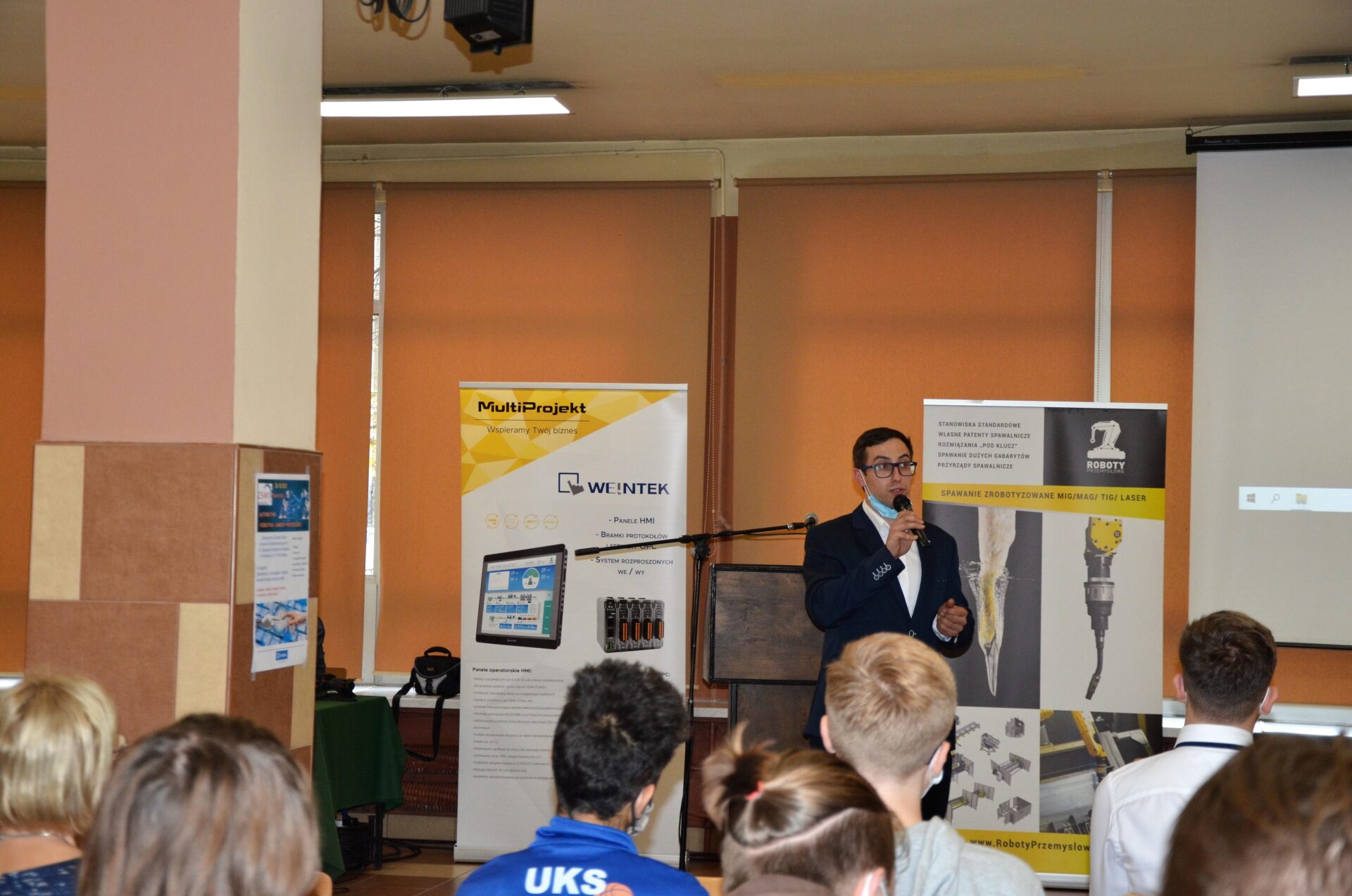 Firmę Multiprojekt Automatyka reprezentował Dominik Turczyński, który jest absolwentem tej szkoły. Dominik, który pracuje w Dziale Pomocy Technicznej, przeprowadził dwie prezentację dla uczniów oraz wykład w sali głównej. Opowiedział m.in. swoją ścieżkę kariery oraz jak wygląda praca w firmie z obszaru automatyki.