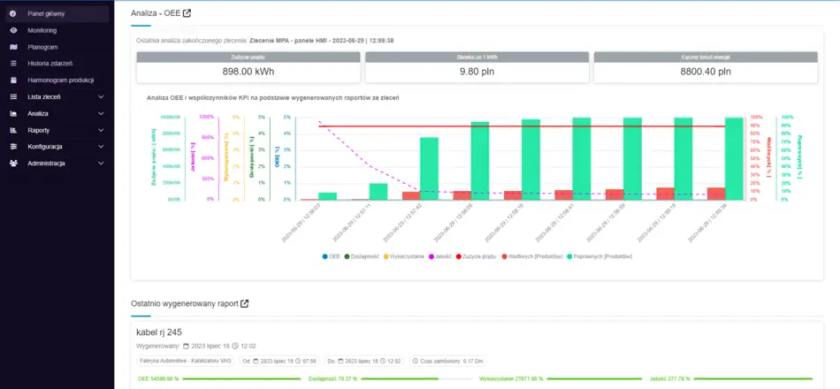 - Moduł OEE/KPI: Personalizowana graficzna interpretacja efektywności wykorzystania maszyn.